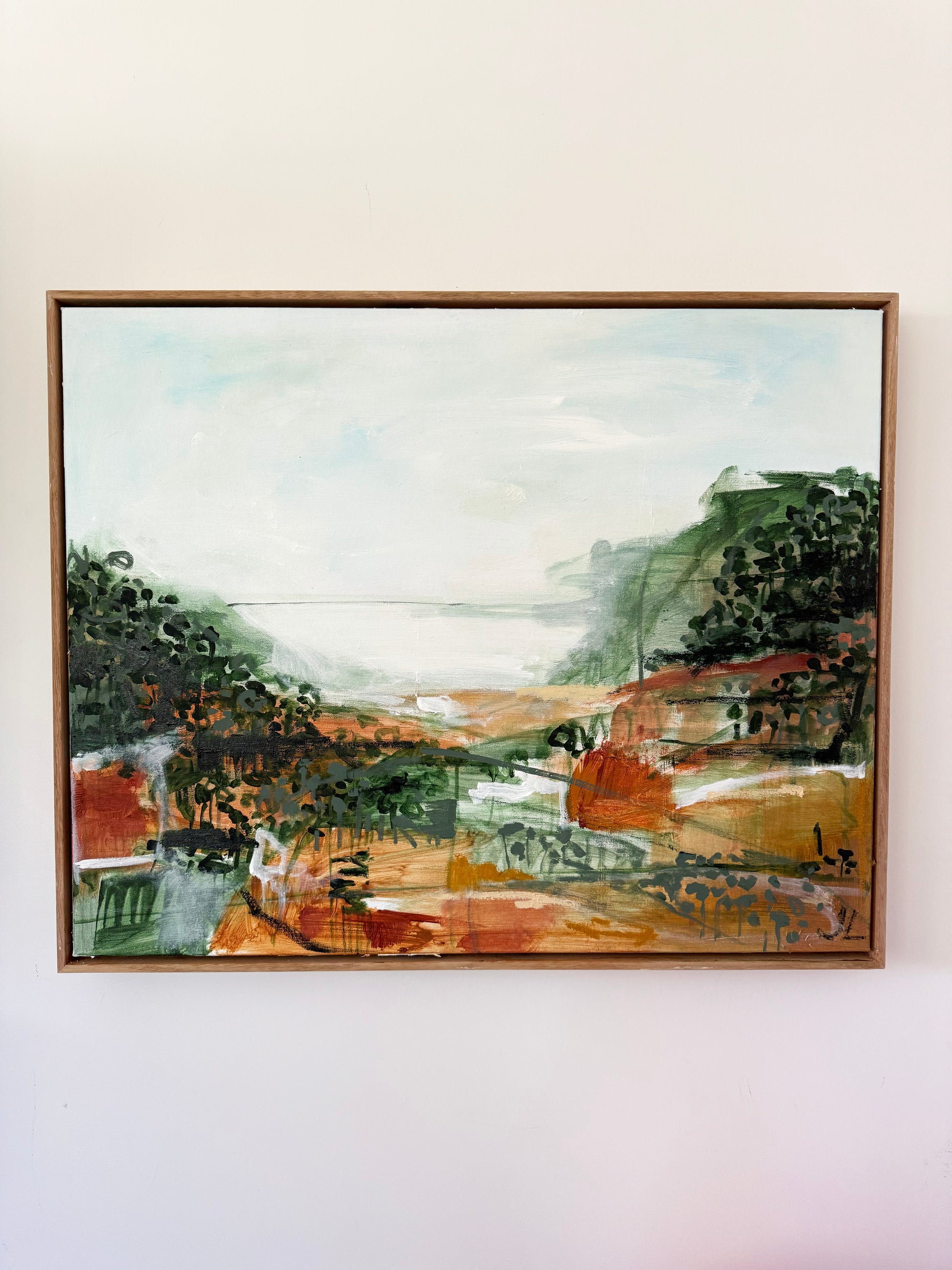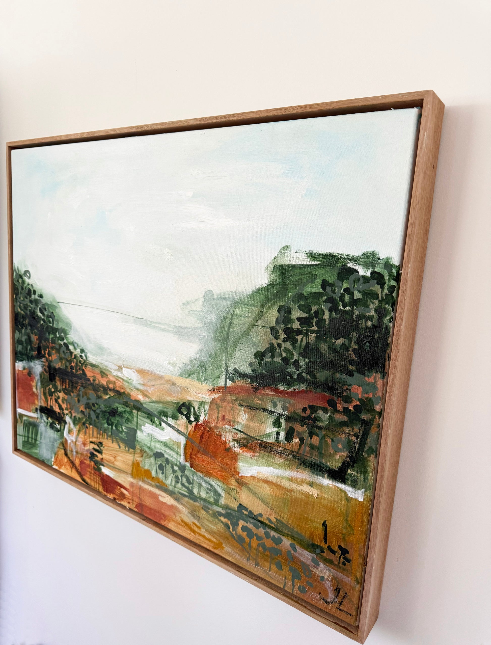 Morning break. The all encompassing view of the Australian bush. Mist settles on the deep Eucalptyus greens as the burnt sienna and ochre play in the foreground. The sun rises softly diffusing the horizon which can just be made out through the ranges. A perfect moment of reflection.
